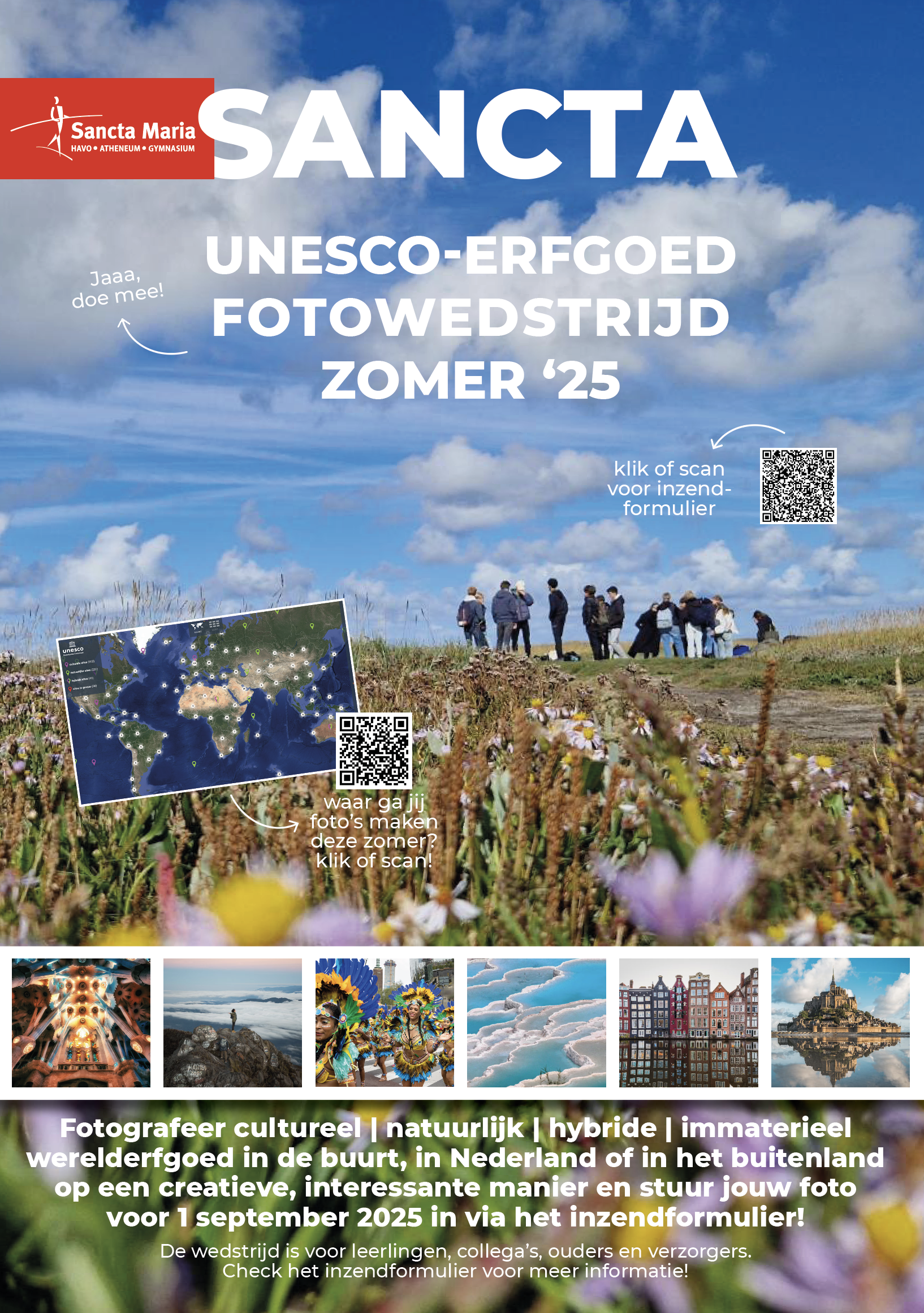 Doe mee aan de Sancta fotowedstrijd en maak tijdens de zomervakantie een creatieve, interessante foto van een plek (natuurlijk en/of cultureel), traditie of feest, dat op de UNESCO-werelderfgoedlijst staat. Of je nou naar het buitenland gaat, in Nederland op vakantie gaat of thuisblijft, er is vaak UNESCO-erfgoed in de buurt. Zorg ervoor dat je ook goed nadenkt over hoe je de foto bijzonder, mooier en kwalitatief goed maakt, zodat het een echte gallery-foto wordt!